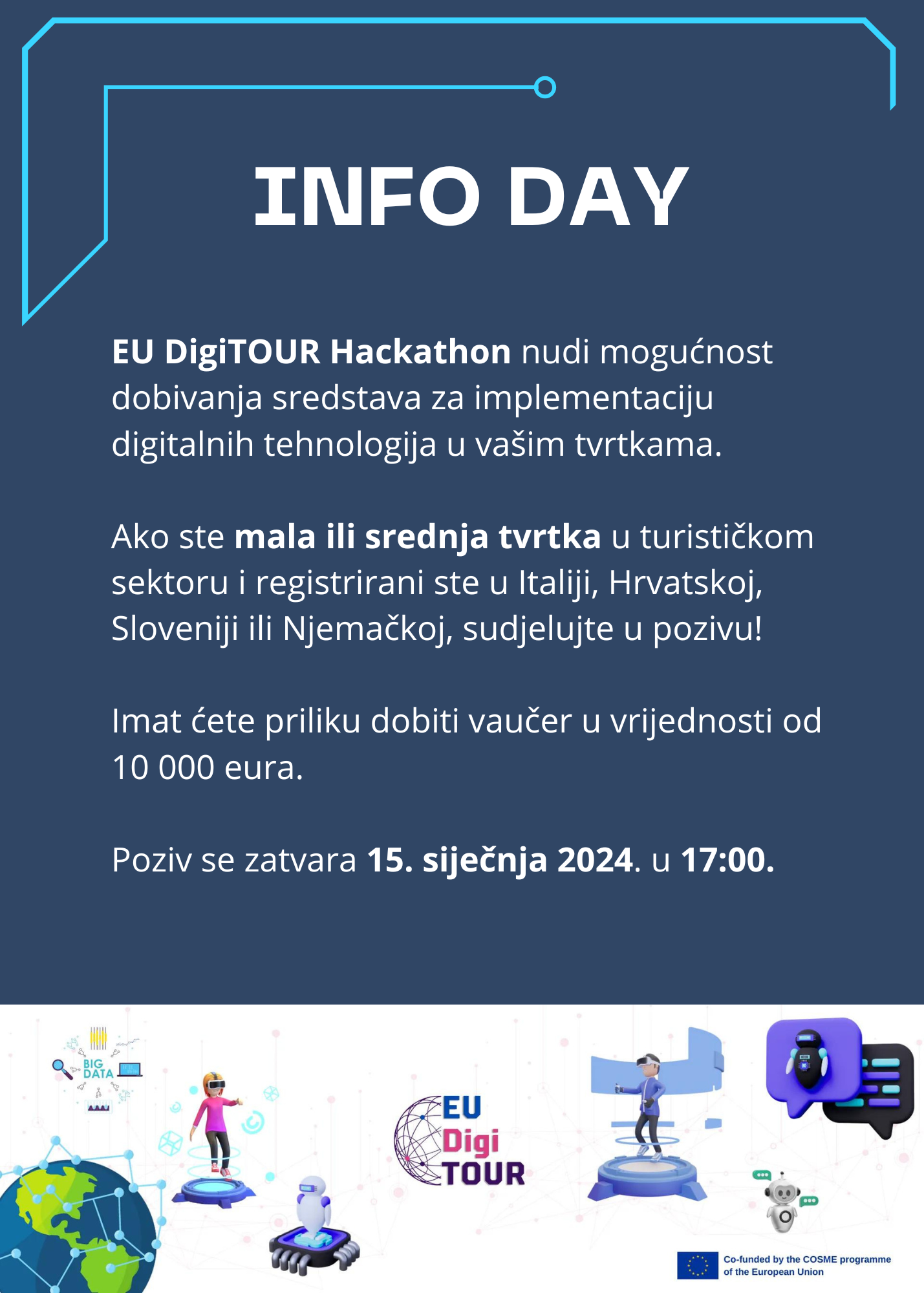 Organiziran u sklopu europskog projekta EUDigiTOUR koji nudi mogućnost dobivanja sredstava za implementaciju digitalnih tehnologija u vaše tvrtke. Ako ste mala ili srednja tvrtka u turističkom sektoru i registrirani ste u Italiji, Hrvatskoj, Sloveniji ili Njemačkoj, sudjelujte u pozivu! Imat ćete priliku dobiti vaučer u vrijednosti od 10.000 €.