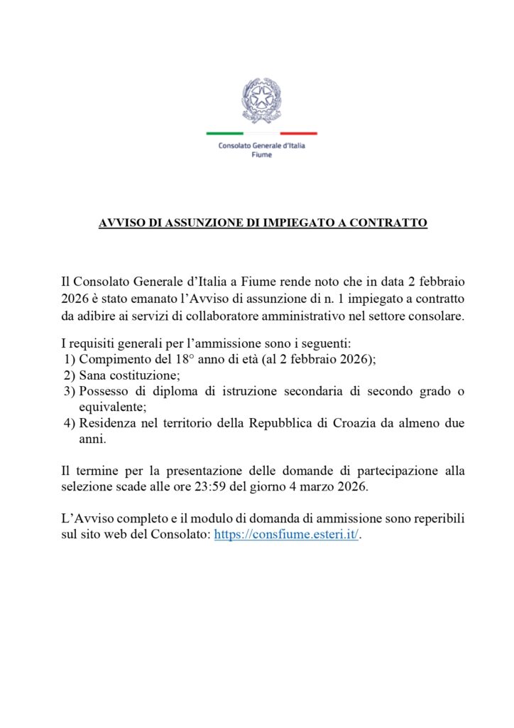 Invitiamo tutti gli interessati a candidarsi al concorso di selezione pubblicato dal Consolato Generale d’Italia a Fiume per il nuovo posto di lavoro aperto di collaboratore amministrativo nel settore consolare.